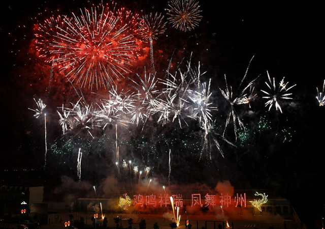 整場(chǎng)焰火晚會(huì)分“雞鳴祥瑞鳳舞神州”、“光明圣景”、 “圣農(nóng)騰飛”、“再創(chuàng)輝煌”四個(gè)樂章。一條條銀色飛龍?jiān)诳罩新祜w舞,清脆的鳴叫聲響徹夜空,預(yù)示著又一年春天的到來。夢(mèng)幻神奇的彩色花束,異彩紛呈的光柱,五光十色的焰火,構(gòu)成一幅幅激情四射、層次分明的動(dòng)感組合,與圣農(nóng)多姿多彩的夜景交相輝映,給人壯觀震撼而又清純靚麗的感覺。