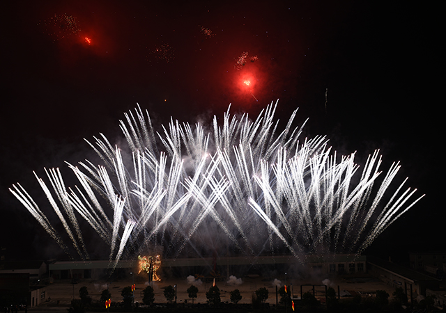 整場(chǎng)焰火晚會(huì)分“圣農(nóng)盛世”、“ 騰飛圣農(nóng)”、“ 冠軍風(fēng)采”、“ 祝福圣農(nóng)”四個(gè)樂(lè)章。有別于往年,今年舉辦的是音樂(lè)焰火晚會(huì),焰火燃放節(jié)奏與音樂(lè)旋律、意境有機(jī)融合,鍛造出一種火與音樂(lè)、光與節(jié)奏的完美效果。晚會(huì)采用3D立柱焰火、無(wú)人機(jī)焰火,9架無(wú)人機(jī)呼嘯而過(guò)、騰空躍起,安裝在無(wú)人機(jī)上的冷光煙花璀璨綻放,伴隨著無(wú)人機(jī)的移動(dòng)、搖擺,在夜空中跳起炫酷的焰火舞。而30多米高的3D立柱上,伴隨著動(dòng)感的音樂(lè),焰火按旋律燃放,時(shí)而左右齊發(fā),時(shí)而旋轉(zhuǎn)噴射,將晚會(huì)推向又一個(gè)高潮。