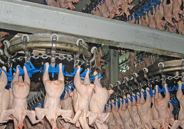 肉雞被放血后,進(jìn)入屠宰流程,自動脫毛、自動去頭、自動去爪、自動掏膛。整個流程全部采用從丹麥Linco公司引進(jìn)的、全球先進(jìn)的自動化肉雞屠宰線及加工設(shè)備:自動切割轉(zhuǎn)掛系統(tǒng)可同時自動切下雞爪、雞頭,并自動將雞只從屠宰線轉(zhuǎn)掛到掏膛線上;自動掏膛及清洗系統(tǒng)可自動分選和分離內(nèi)臟和心肝,提高了生產(chǎn)效率和產(chǎn)品衛(wèi)生水平。自動化設(shè)備節(jié)省了大量勞動力,流水線上只需配備幾名檢驗人員,對不合格產(chǎn)品進(jìn)行剔除。